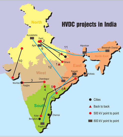 • North-East Agra ±800 kV Multi-Terminal Link (1728 km): Transmits hydropower from the Northeast to the north. Multi-terminal configuration pools power from multiple stations into Agra with reduced losses.
